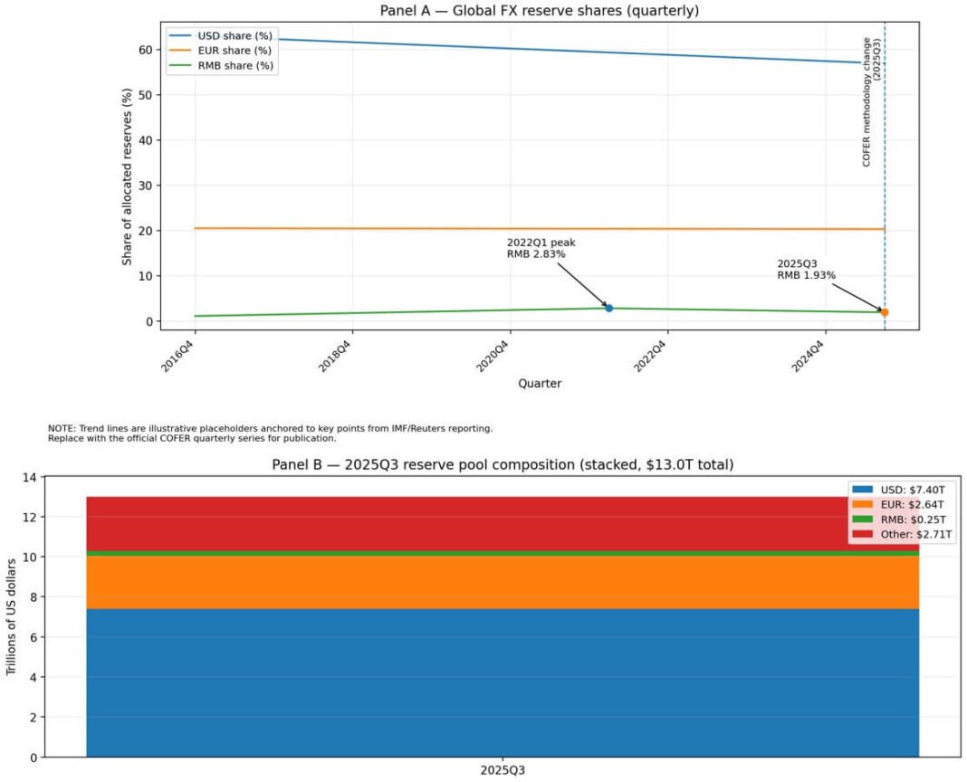 The International Monetary Fund’s latest reserve data shows the renminbi holding just 1.93% of global foreign exchange reserves in the third quarter of 2025, down from a 2.83% peak in early 2022.