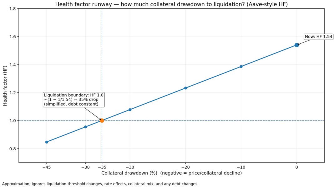 At a health factor of 1.54, the wallet has runway but not comfort. A 38% drawdown in collateral value would trigger liquidation.