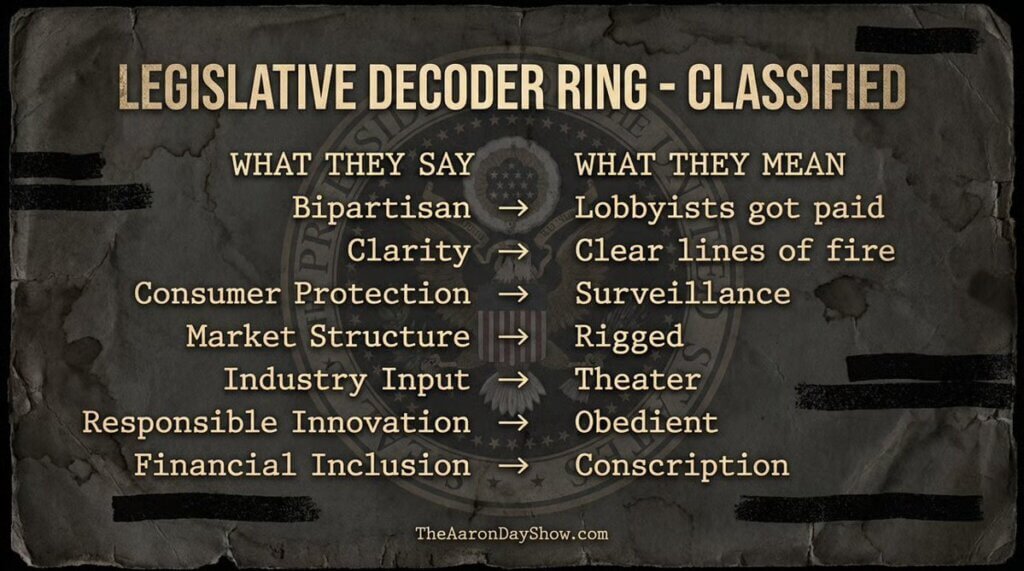 Financial freedom advocate, Aaron Day, also offered a “decoder ring” framing that maps “consumer protection” to “surveillance” and “market structure” to “rigged” outcomes.