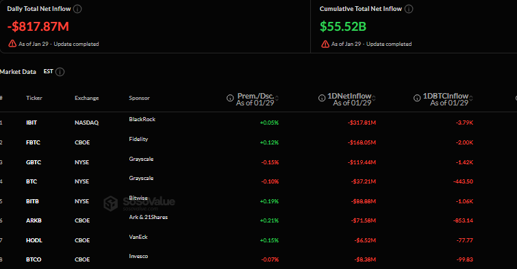 Sosovalue data shows that spot Bitcoin ETFs recorded net daily outflows of $817.87 million on January 29, erasing gains from earlier in the month and pushing January into negative territory overall.