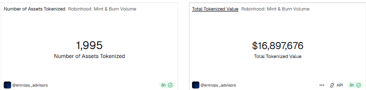 On-chain data cited by tokenization trackers shows that Robinhood has minted nearly 2,000 such stock tokens worth just under $17 million, a relatively small figure compared with other tokenization platforms whose offerings exceed $500 million.