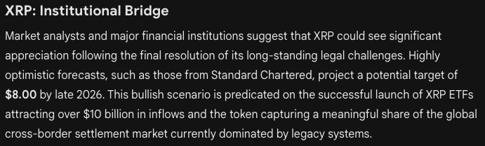 Ripple’s XRP ($XRP) began 2026 with strong upward momentum, gaining roughly 19% in the first week of the year. With the token currently trading around $1.55, Gemini estimates that a sustained bullish trend could push XRP as high as $8 by the end of 2026. That would represent gains of roughly 420%, more than quadrupling.
