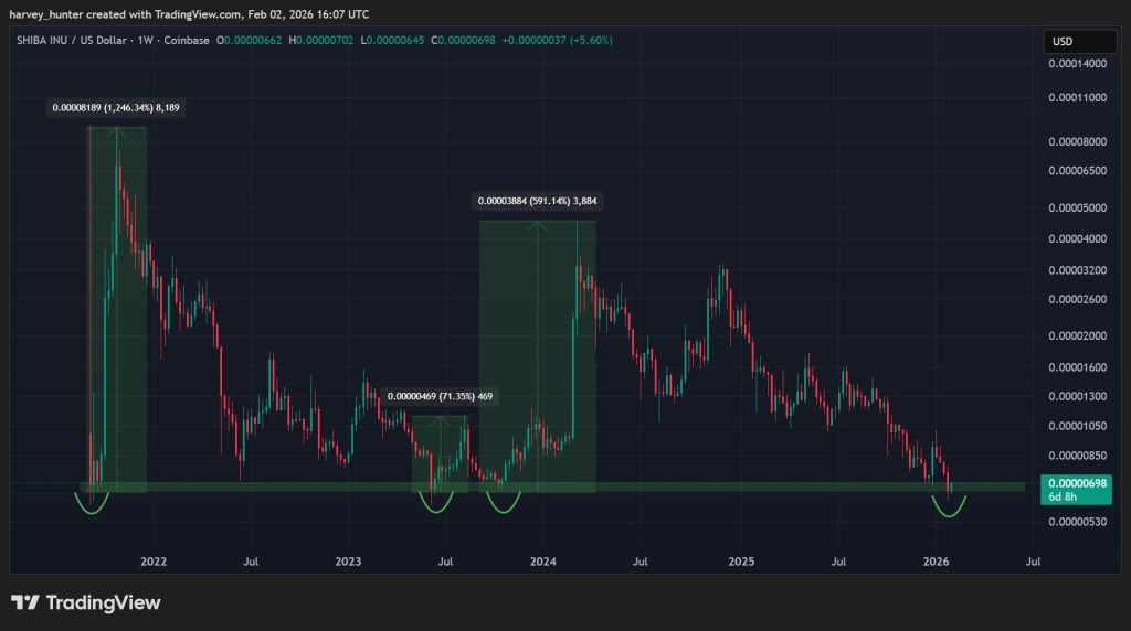 A 15% weekly drawdown has pushed SHIB back into its most important historical proving ground: a life-long demand zone around $0.0000066.