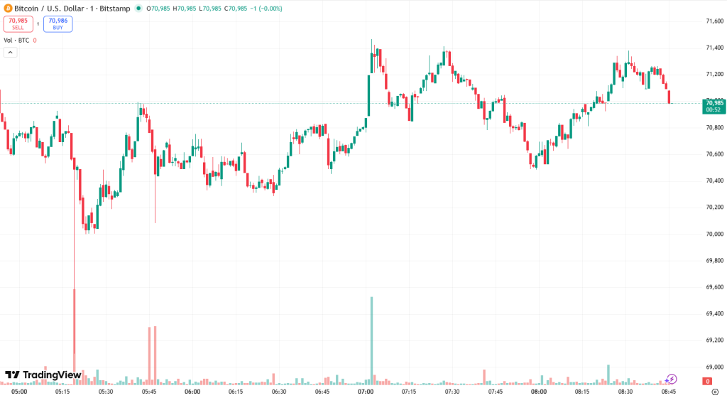 At the time of writing on Thursday morning, BTC was trading at $70,884. The price saw a relatively gradual decrease from the intraday high of $76,472 to the intraday low of $70,119.