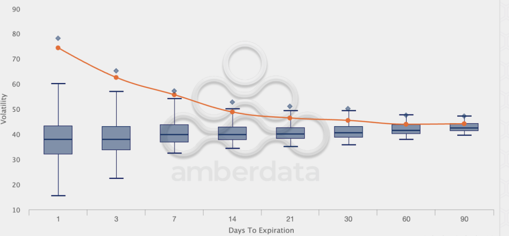 BTC volatility term structure (orange line) with box plot of historical data (blue) overlaid.